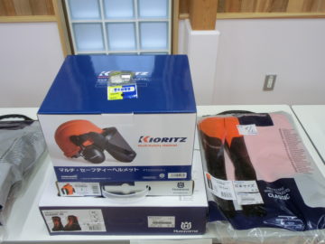 また、式の後半では、古賀校長から入校生に安全に気を付け、大きな事故なく無事に卒業することを祈念し、防護ジャケットをはじめとした安全防護服一式が授与されました。この防護ジャケットなどは、チェーンソー作業等の際にケガから体を守ってくれるものであり、入校生と1年間苦楽を共にするパートナーでもあります。
