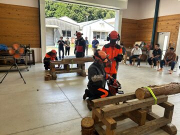 参加者の皆様には、林業大学校の授業やチェーンソー競技の実演を「見て」、林業大学校卒業生の話を「聞いて」、チェーンソー操作を実際に「体験して」、充実した時間を過ごしていただきました。