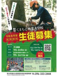 長期課程では、林業に必要な技術と現場力を身に付けて、くまもとの未来を山から育む人材の育成を後押しします。林業の基礎から専門的な技術までをしっかりと学び、研修期間は座学50日と実習150日の計200日間で、県北校と県南校の2校体制で行っています。